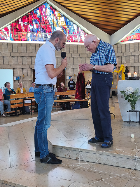 Zum Abschluss sprach Herr Hartmann einen besonderen Dank aus: Er überreichte dem Küster der St.-Paulus-Kirche, Herrn Emmerling, ein kleines Geschenk. Damit würdigte er dessen jahrelange Unterstützung für die Schule. Herr Emmerling ist es, der zuverlässig die Türen öffnet, unsere Schulgottesdienste helfend begleitet und die Schulgemeinschaft stets freundlich begrüßt.