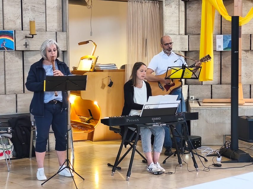 Musikalisch wurde der Gottesdienst vielseitig begleitet. Stephanie Muhl spielte dabei nicht nur die Orgel, sondern auch Piano. Unterstützt wurde sie von Nicole Stöppler an der Flöte und von Christoph Hartmann an der Gitarre. Gemeinsam sorgten sie für eine lebendige musikalische Atmosphäre, die das Thema des Gottesdienstes zusätzlich vertiefte. Gesungen wurden bekannte Lieder, die die Schulgemeinschaft miteinander verbanden: „Jetzt ist die Zeit, jetzt ist die Stunde“, „Von allen Seiten umgibst du mich“, „Da wohnt ein Sehnen tief in uns“, „Da berühren sich Himmel und Erde“, „Geh unter der Gnade“ sowie abschließend „Jesus Christ“.
