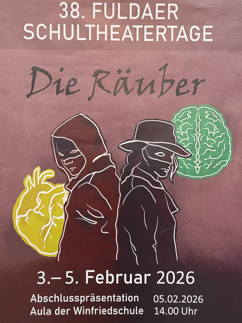 Lampenfieber, letzte Kostümchecks und gespannte Blicke hinter den Vorhang: 15 Schülerinnen und Schüler aus den Klassen 11b und 11d haben im Februar an den 38. Fuldaer Schultheatertagen teilgenommen und in zweieinhalb Tagen eine siebenminütige Sequenz mit dem Titel „Das Stravello-Desaster“ – inspiriert von Friedrich Schillers „Die Räuber“ – mit Unterstützung der Schauspielerin und Theaterpädagogin Veronique Weber-Karpinski erarbeitet.