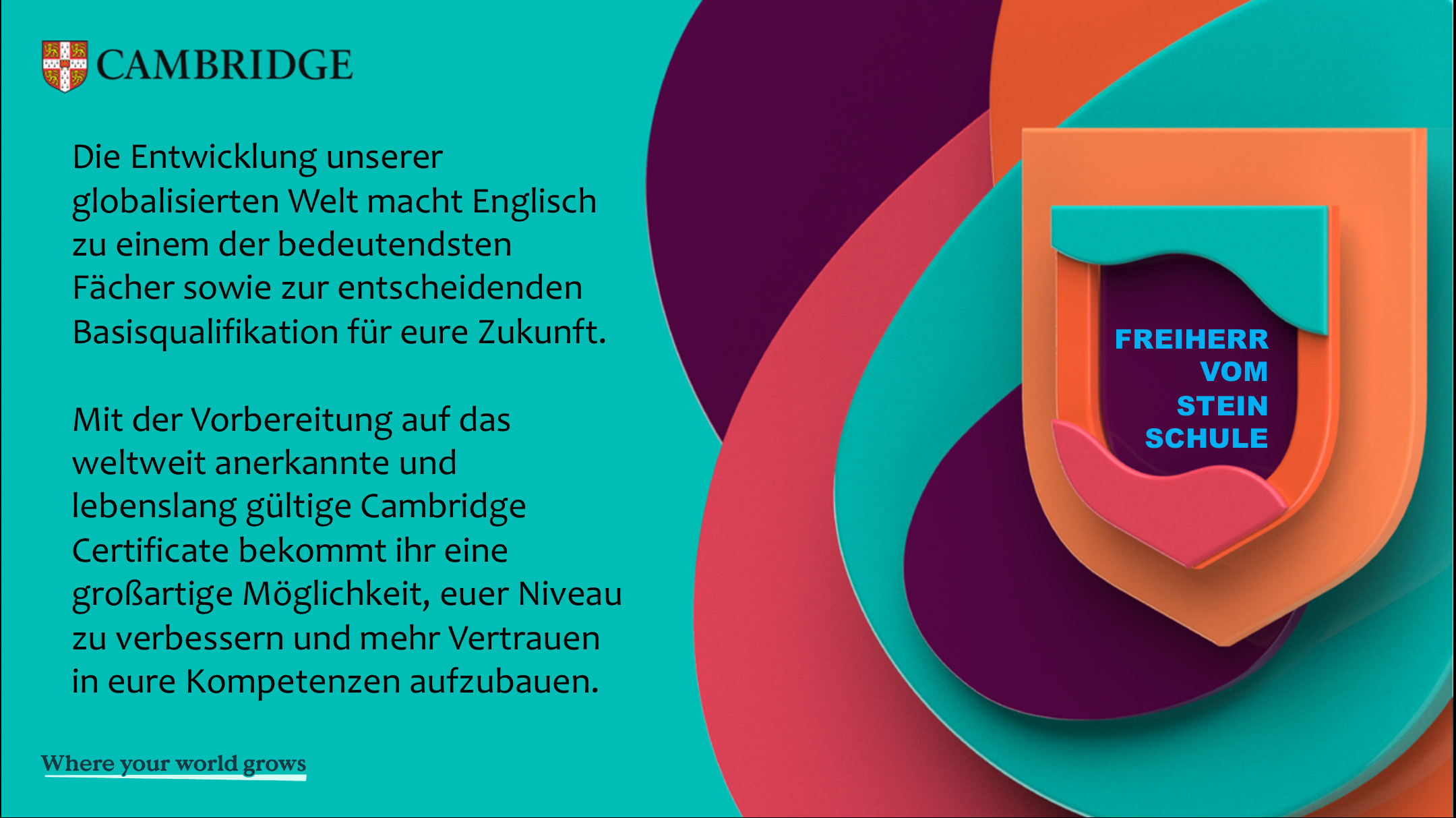 Im Rahmen einer Informationsveranstaltung erfuhren die ca. 30 interessierten Schülerinnen und Schüler der Q1, die der Einladung gefolgt waren, am vergangenen Dienstag Näheres zum neuen Vorbereitungskurs auf das Cambridge Certificate an der Freiherr-vom-Stein-Schule Fulda.
