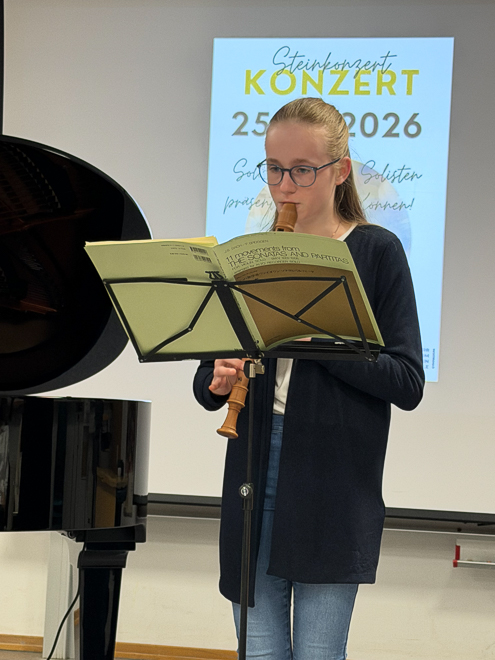 In einem stilistisch vielseitigen und anspruchsvollen Konzert glänzte zu Beginn Sam Spindler, Klasse 6, mit dem bekannten und eindrucksvollen Klavierstück „Gewitter“, Opus 109, Nr.13 von Burgmüller, welches das Wetterphänomen hörbar werden ließ. Greta Böhm, Rieke Burgwal, Mia Hergert und Emily Kormann aus der Bläserklasse 6, die erst seit ca. 1,5 Jahren Instrumentalunterricht auf der Querflöte erhalten, präsentierten das zweistimmig und sauber intonierte Stück „Donna, Donna“, das sich in harmonisch Moll an der Tradition jiddischer Musik orientiert, seine Bekanntheit jedoch erst in den 1960er Jahren durch Joan Baez erlangte. Franziska Weber aus Klasse 7 beeindruckte mit ihrem Beitrag an der Altblockflöte mit der „Gigue“ aus Johann Sebastian Bachs „Partita 3“, die im Original für Violine komponiert wurde. Ein besonderes Highlight des Abends war der Beitrag des erst elfjährigen Onrie-Ilaj Bajrovik aus Klasse 5, der seine erstaunliche Fingerfertigkeit und Ausdruckskraft mit den Stücken „Mazurka Glissando“ von Ernesto Lecuona, dem „kubanischen Gershwin“, und „O Polichinello“ von H. Villa-Lobos präsentierte und mit kräftigem Applaus belohnt wurde. Johanna und Franziska Weber, beide Klasse 9, trugen im Anschluss die beiden Sätze „Soave“ und „spirituoso“ aus Georg Friedrich Telemanns Sonate Nr. 6 für Altblockflöten vor und zeigten einmal mehr, wieviel Rhythmus und Schwung in der Musik des 18. Jahrhunderts steckt. Einen besonderen Moment schenkte Kerem Kaya den Zuhörern mit seinem Vortrag auf der Konzertgitarre. Neben einem beschwingten türkischen Volkslied beeindruckte er mit seiner Spielfreude und Fingerfertigkeit in einer eigenen Version des bekannten „Hit the Road, Jack“ von Ray Charles. Jack Dirksen, Klasse 9, brachte den Flügel in all seinen Facetten mit dem technisch mit vollgriffigen Akkorden wie musikalisch anspruchsvollen „Prelude in cis-Moll“, Opus 3, Nr. 2 von Sergej Rachmaninow zum Klingen. Die drei Schwestern Johanna, Mathilda und Franziska Weber wagten sich im Anschluss an die beiden Sätze „Lentement“ und „Soave“ aus Johann Matthesons Triosonate Nr. 1 und überzeugten mit Präzision und Tonkontrolle. Ruben Alva Pramme, Jahrgangsstufe 13, wagte sich mit seinem Solobeitrag auf der Oboe an die beiden Sätze „Allegro“ und „Andante moderato“ des anspruchsvollen Stücks „Musik für Oboe allein“ von Erich Sehlbach an Musik aus dem 20. Jahrhundert, das er wunderbar meisterte. Den Abschluss eines gelungenen Konzertabends gestaltete Matteo Lotz, Jahrgangsstufe 12, mit „Defying Gravity“ aus dem Musical „Wicked“, in dem er die Zuhörenden in eine klangliche Welt voller Magie und Emotion entführte. Durch das Programm führte Musiklehrerin Corina Müller-Mohr mit unterhaltsamen und interessanten Hintergrundinformationen. Dass sich das Üben gelohnt hat, davon konnten sich die Zuhörerinnen und Zuhörer selbst überzeugen und bedankten sich mit einem herzlichen Applaus bei den jungen Musici für einen gelungenen Abend. Herr Dr. Brüdigam bedankte sich bei allen Musizierenden sowie den Eltern und Unterstützern der jungen Talente, die mit viel Spielfreude und Ausdruck ihr Können zeigten.